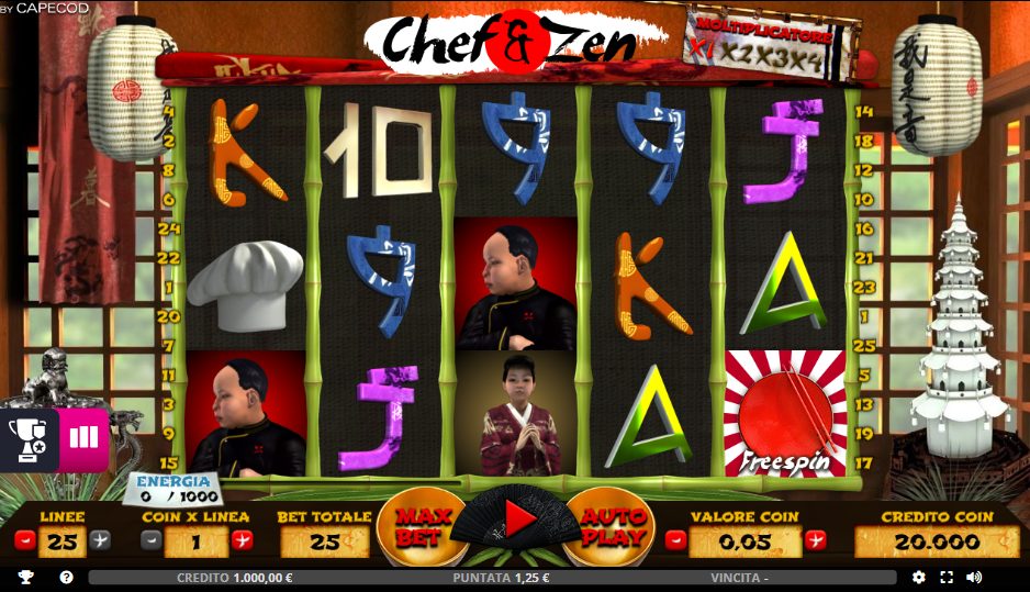 Chef & Zen is a classic slot game with 5 reels and 20 paylines. The game features various symbols, including chef hats, sushi, and kitchen utensils. To win, you need to land matching symbols on a payline from left to right.